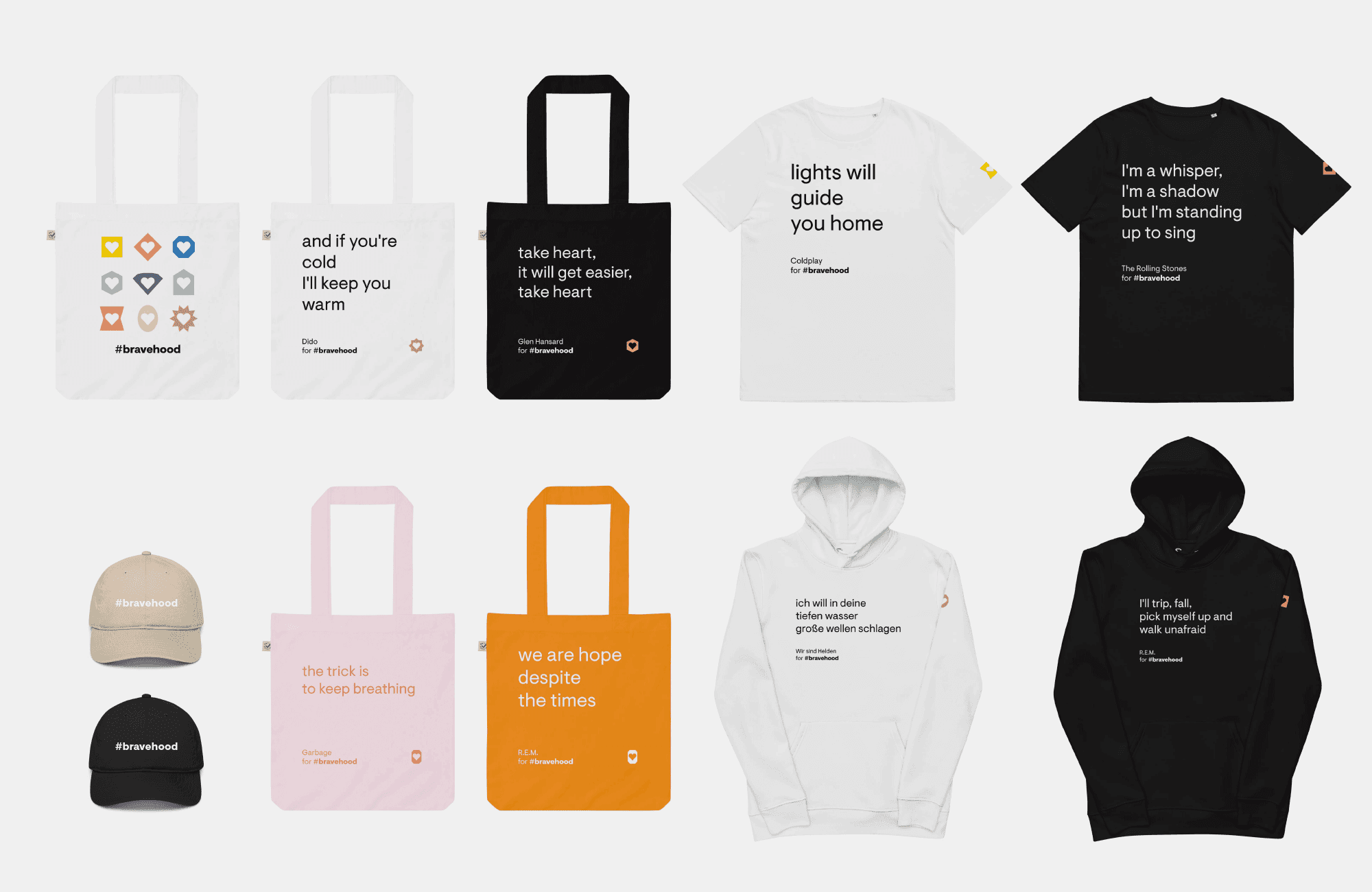 Szenario Design developed the visual identity for #bravehood, a charity campaign supporting children in Ukraine by selling merchandise that featured lyrics licensed by global musicians. To help emphasize the brand’s messaging of shared humanity, I was brought in to create a motion toolkit that could help bring the brand to life, and provide the tools so #bravehood could easily turn their messaging into tangible visuals.