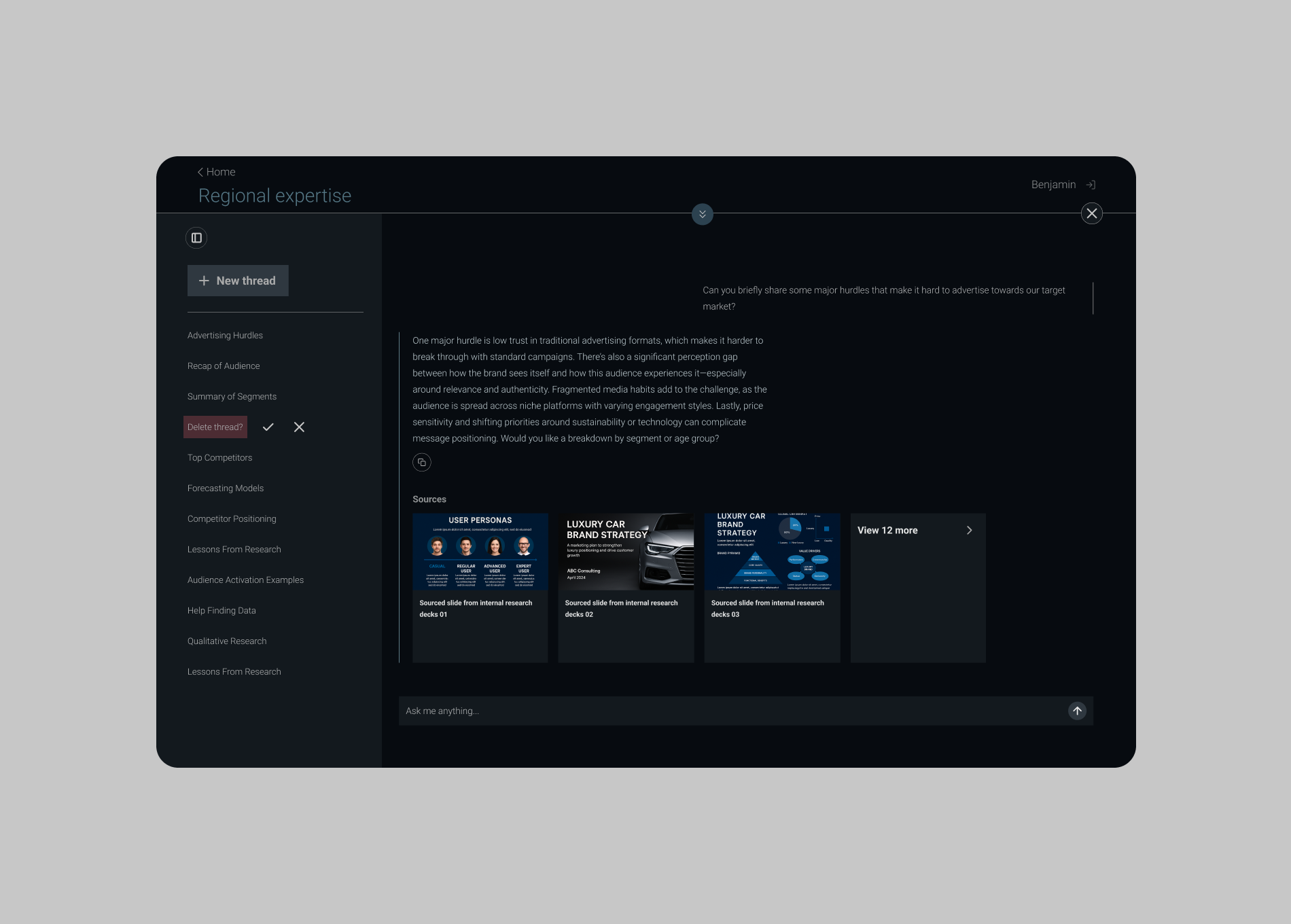 The global strategy team at a Fortune 500 car company spent over a year developing a brand strategy for a new luxury brand. The result was extensive research — but it lived across disconnected decks, documents, and teams.