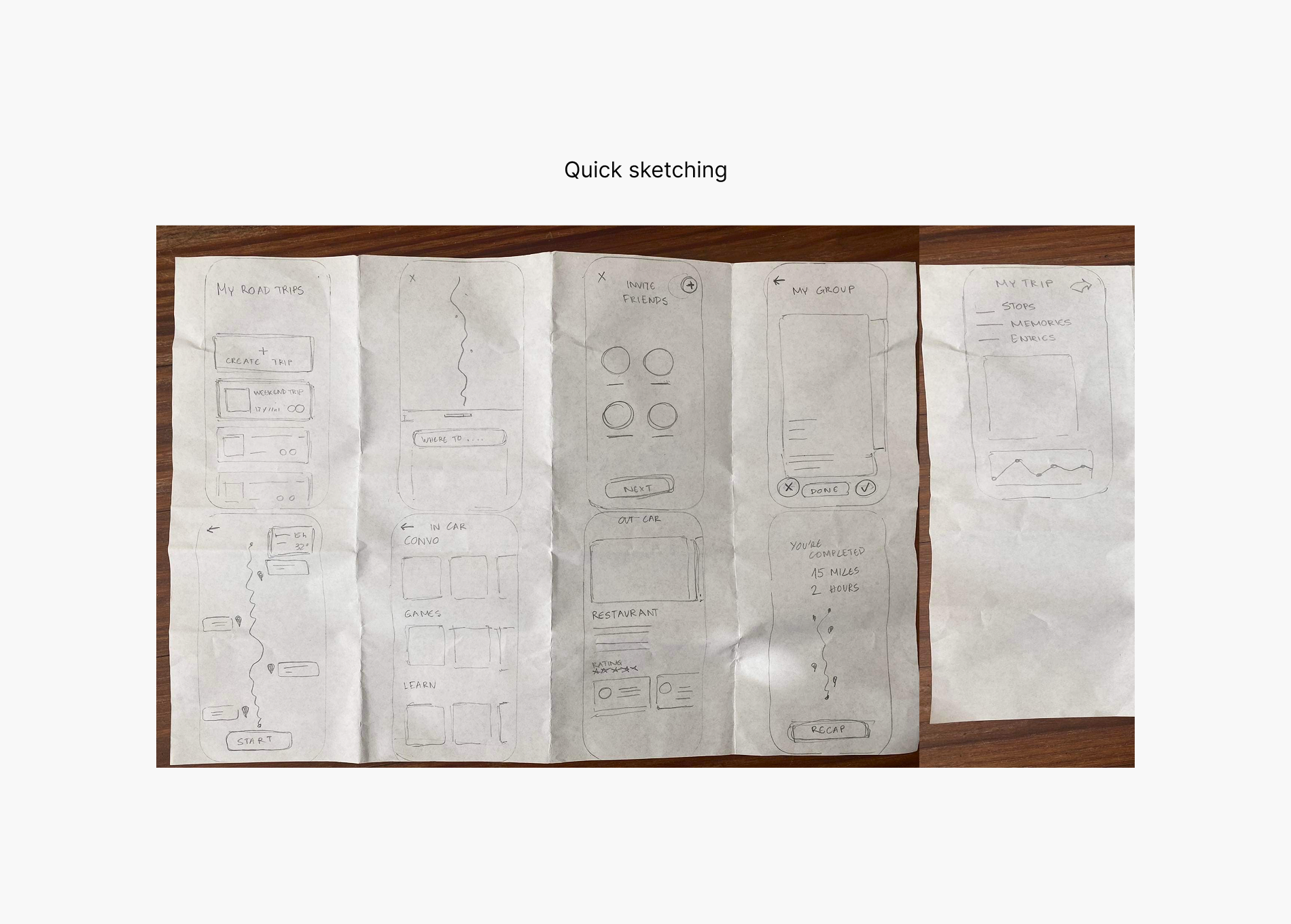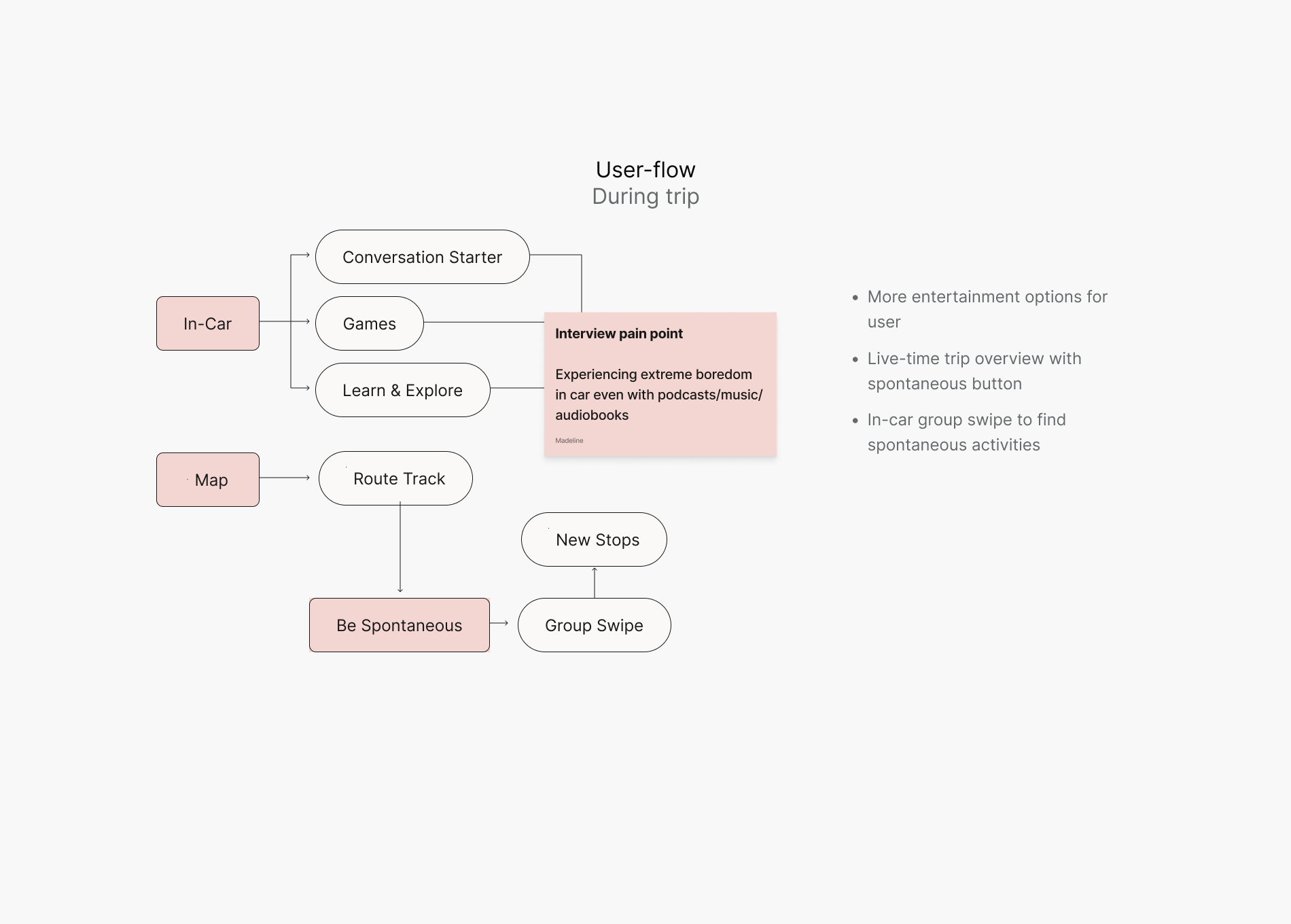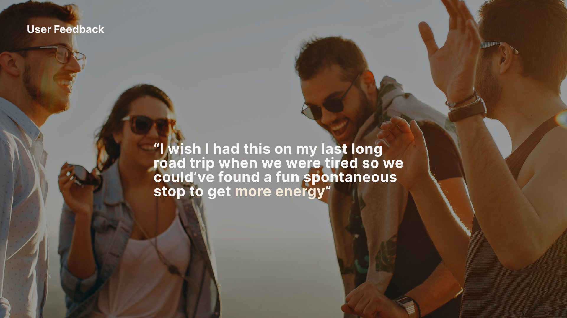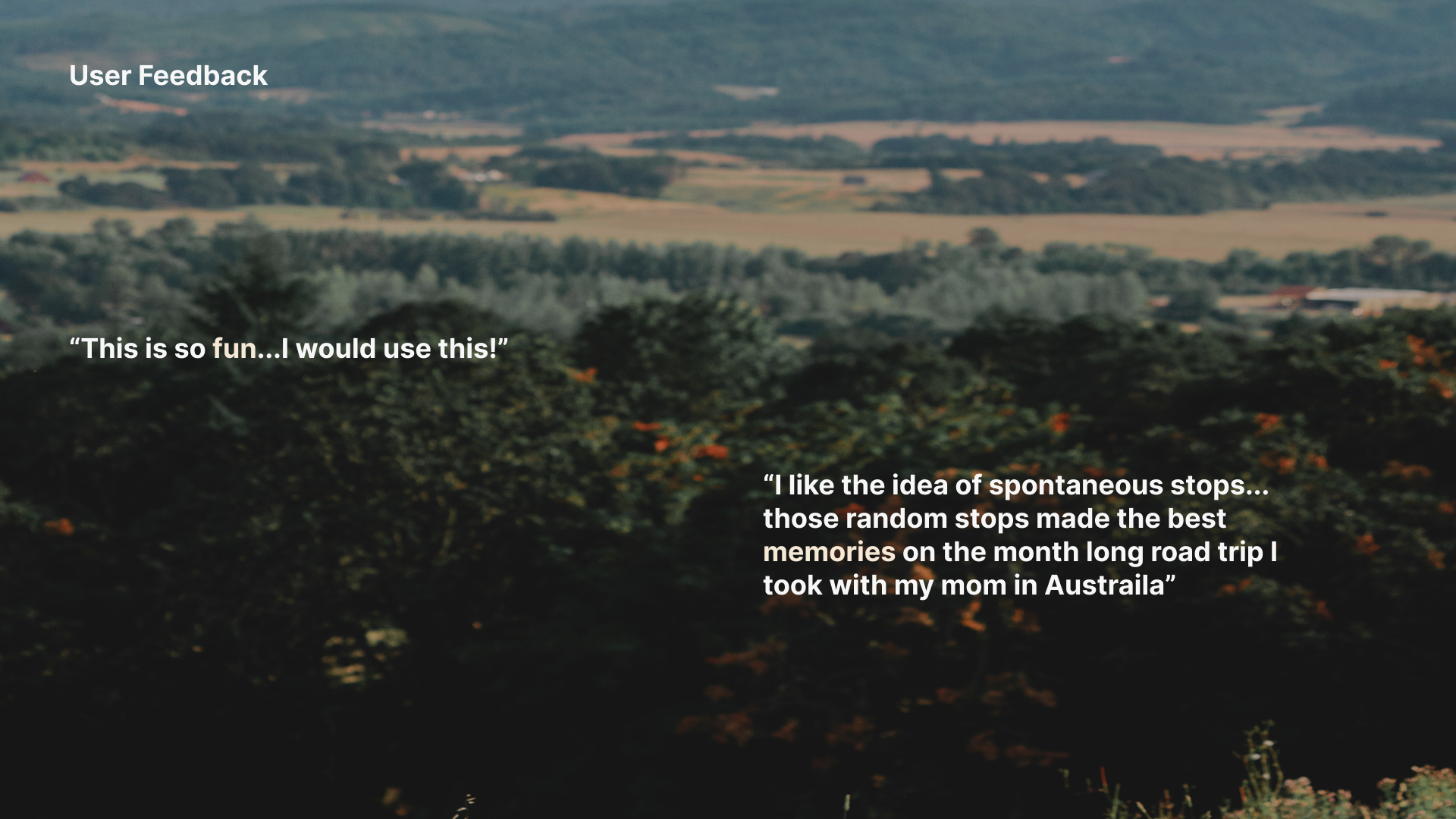 We conducted user interviews to understand people’s motivations for taking road trips, their favorite moments, and the challenges they faced along the way. We learned that travelers valued the emotional richness of the journey — especially the spontaneous, quirky discoveries along the road. One participant shared, “On my road trip, there was a junkyard right next to the highway where a guy collected junk and built insane 50-foot sculptures. It was my favorite part of the trip.”