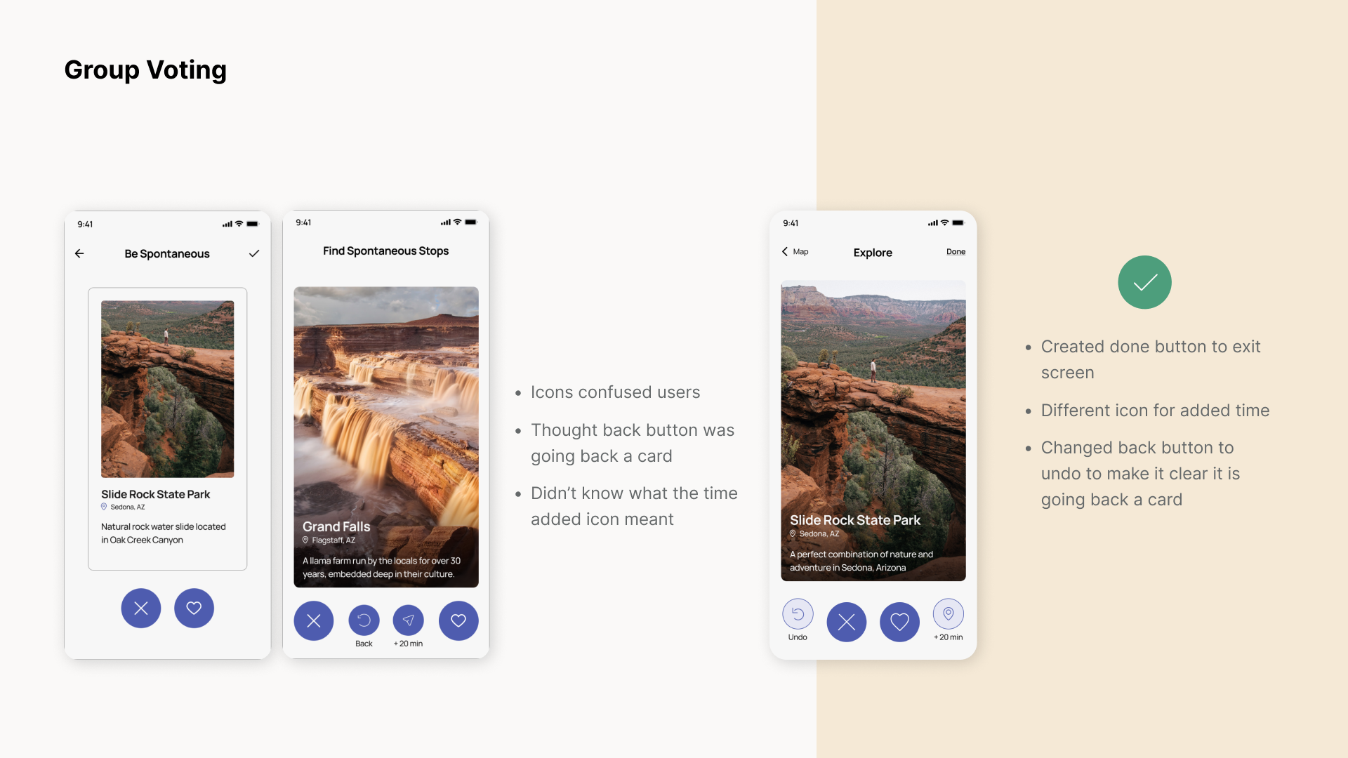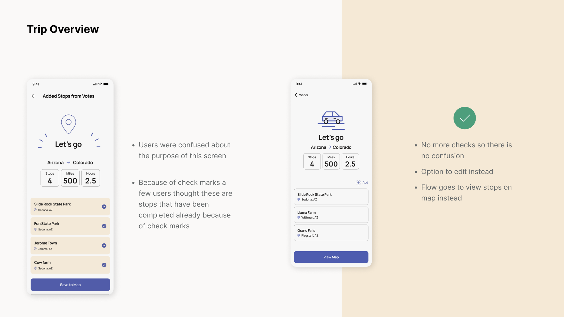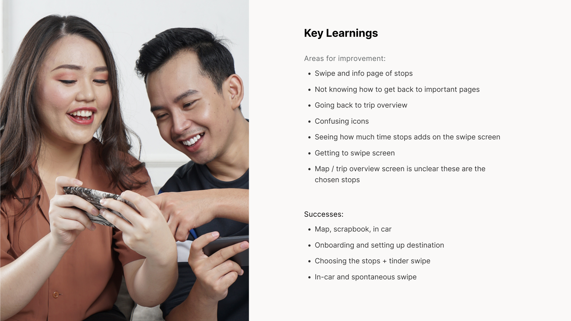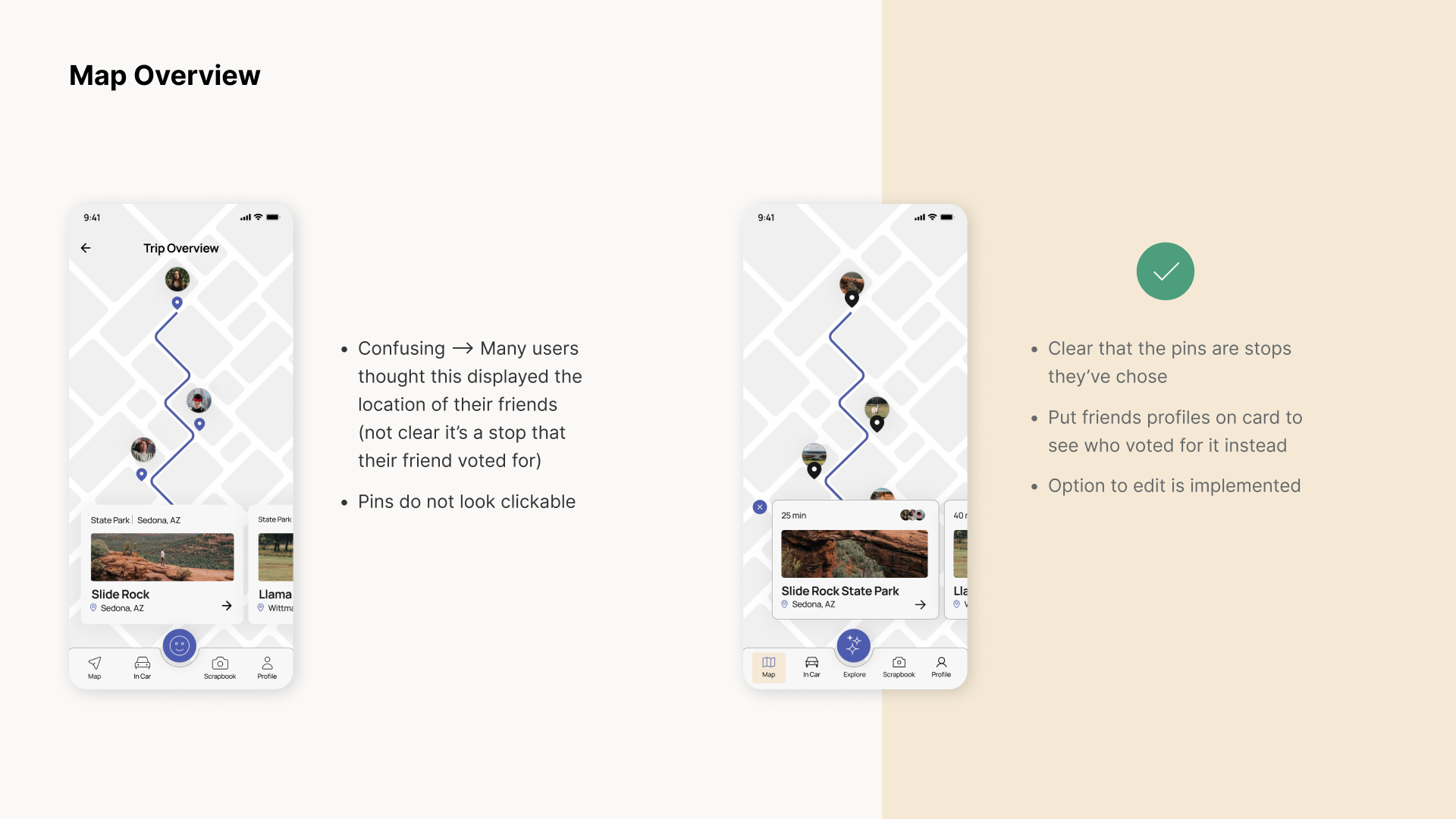 We conducted user interviews to understand people’s motivations for taking road trips, their favorite moments, and the challenges they faced along the way. We learned that travelers valued the emotional richness of the journey — especially the spontaneous, quirky discoveries along the road. One participant shared, “On my road trip, there was a junkyard right next to the highway where a guy collected junk and built insane 50-foot sculptures. It was my favorite part of the trip.”
