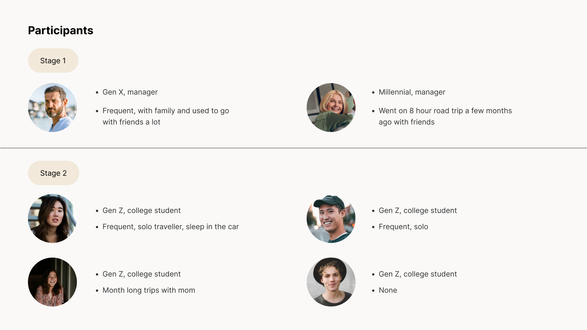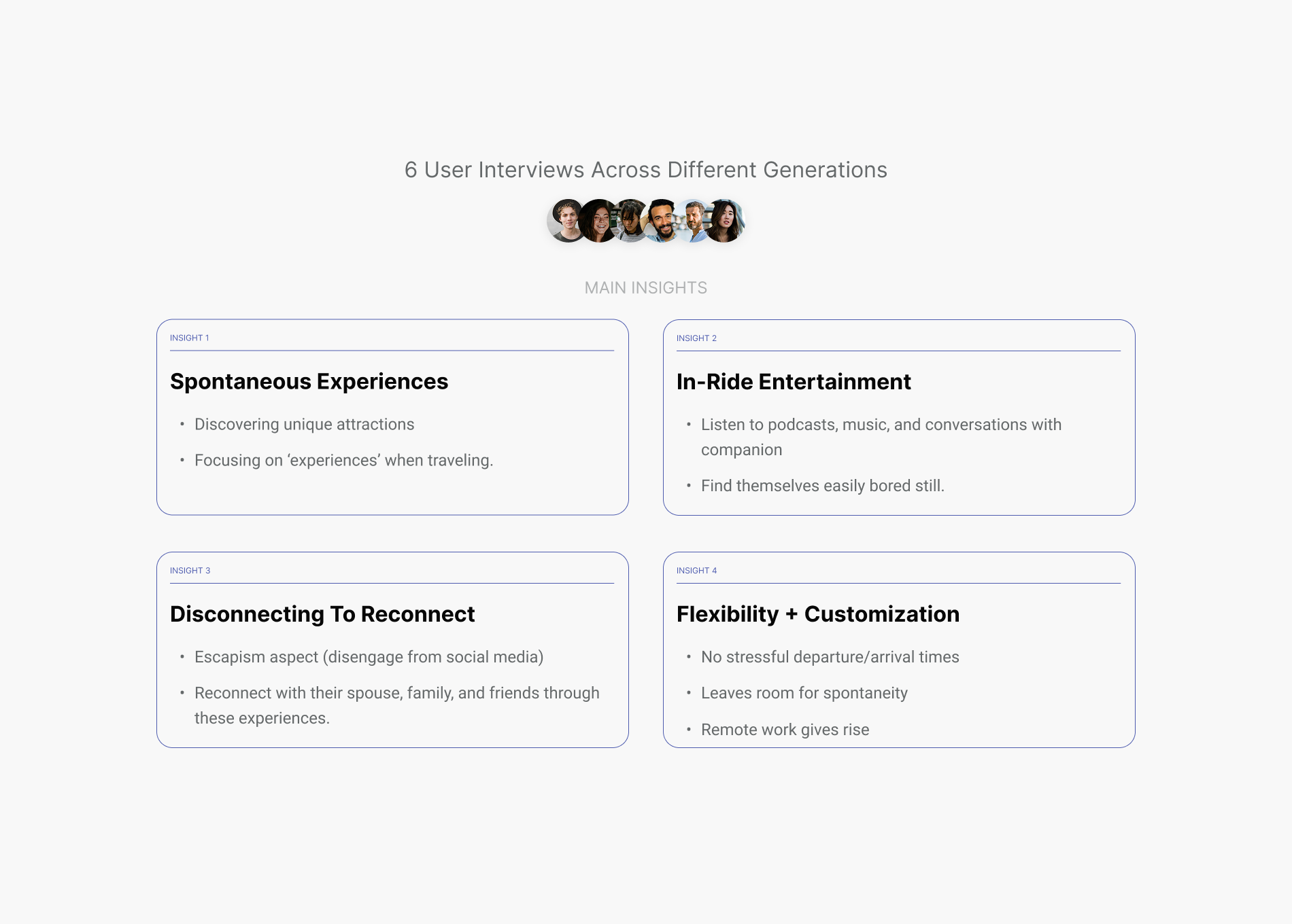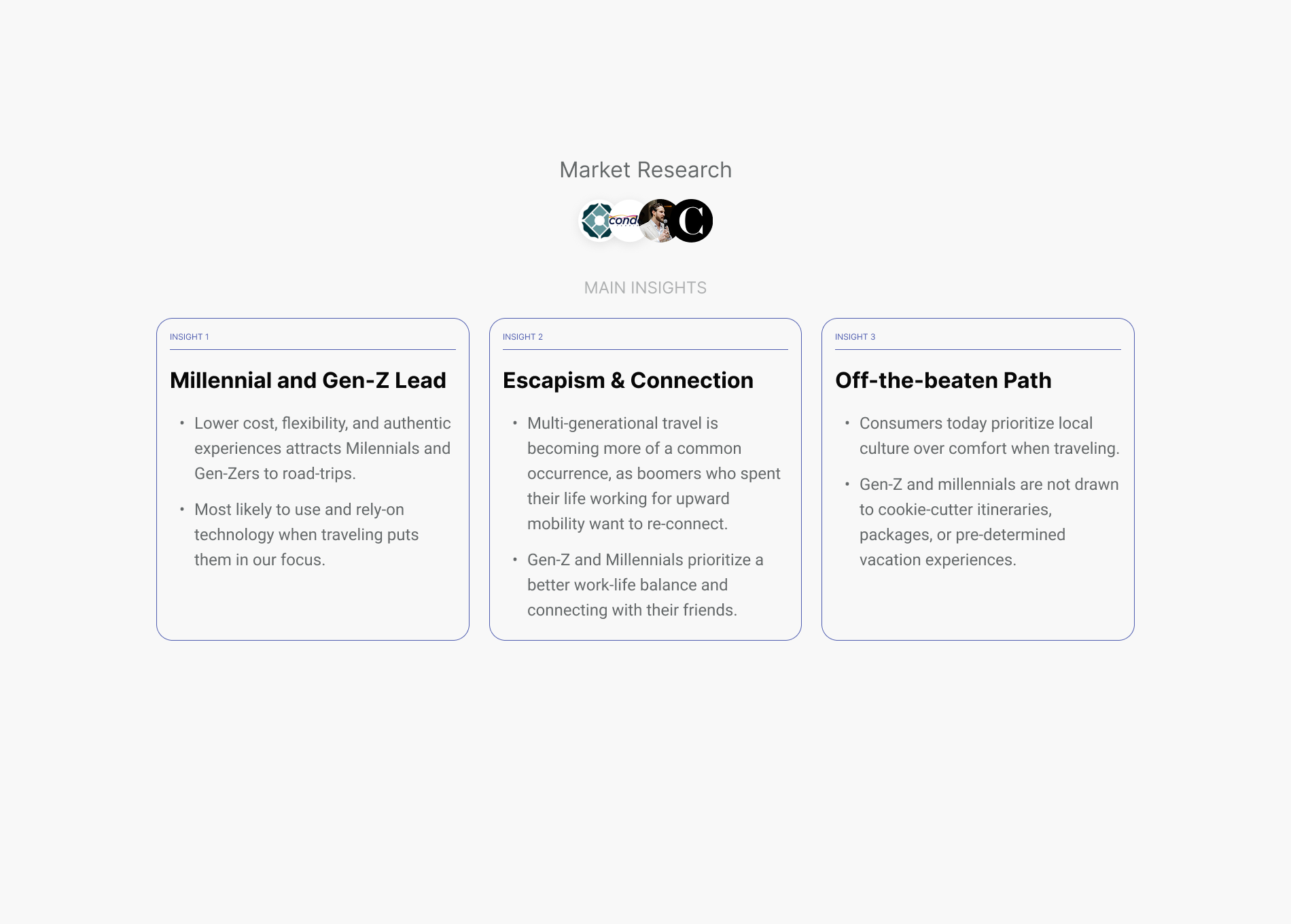 We also conducted desk research to understand the consumer trends and market forces shaping modern travel behavior. Across the board, we found that people were driven by the emotional side of travel — the need for connection, freedom, and meaningful experiences. Gen Z and Millennials were leading the resurgence of road trips, drawn to their low cost, flexibility, and alignment with a better work-life balance.