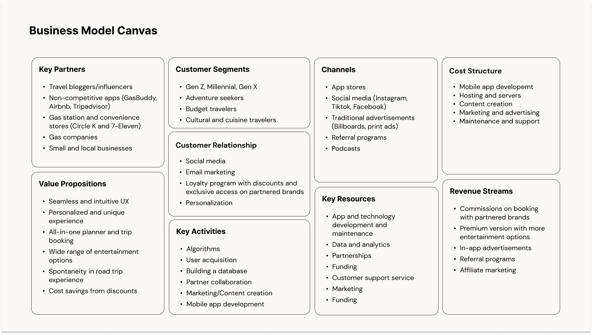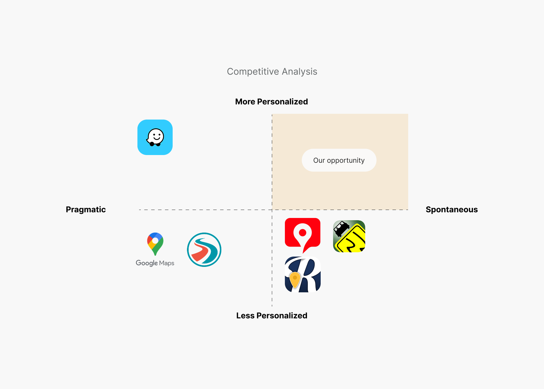 When we analyzed the market through the lens of personalization and emotional experience — contrasting spontaneous versus pragmatic app solutions — a clear gap emerged. Most existing road trip apps focused narrowly on efficiency and navigation, overlooking the deeper emotional forces that make road trips memorable.