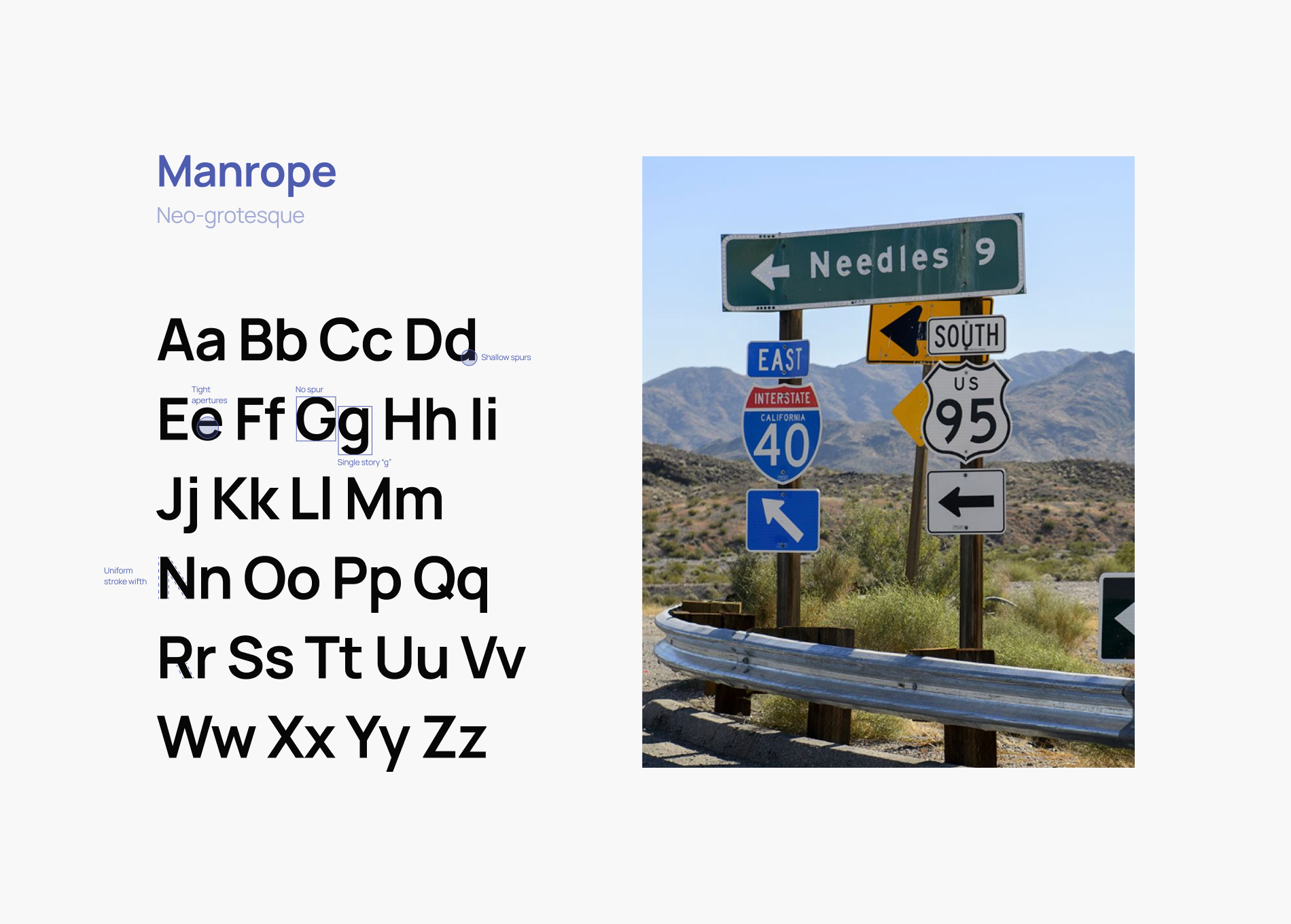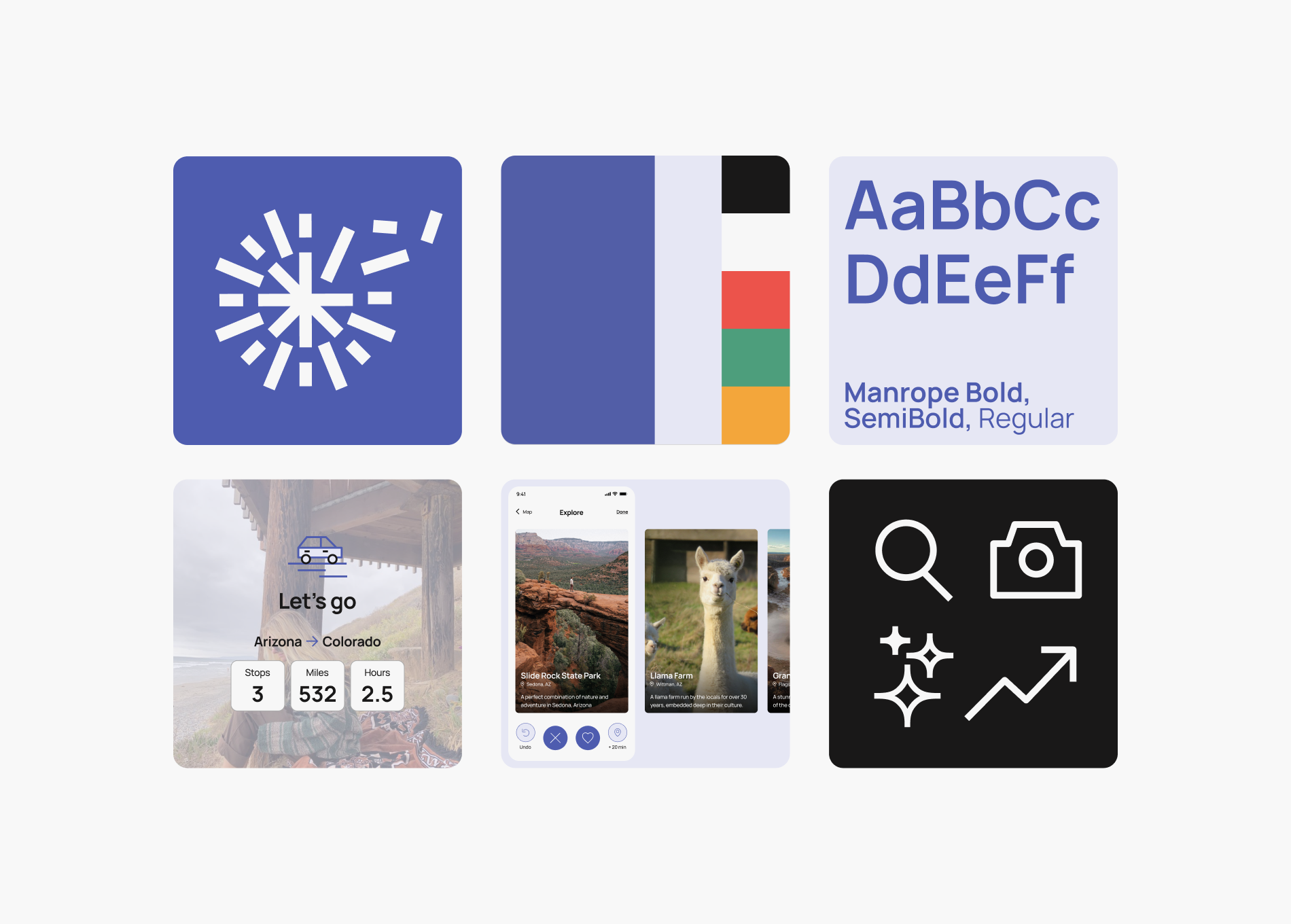 To achieve this, we combined a robust, minimalist component library with expressive illustrations inspired by local attractions. The purple accent color evokes a sense of mystery and stands out in contrast to the natural browns, greens, and yellows found along the road. The typeface Manrope and its neo-grotesque structure ties it all together — a modern nod to the utilitarian signage typography that defines America’s highways.